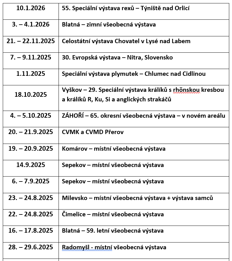 Termíny významných chovatelských akcí - ZO ČSCH Záhoří